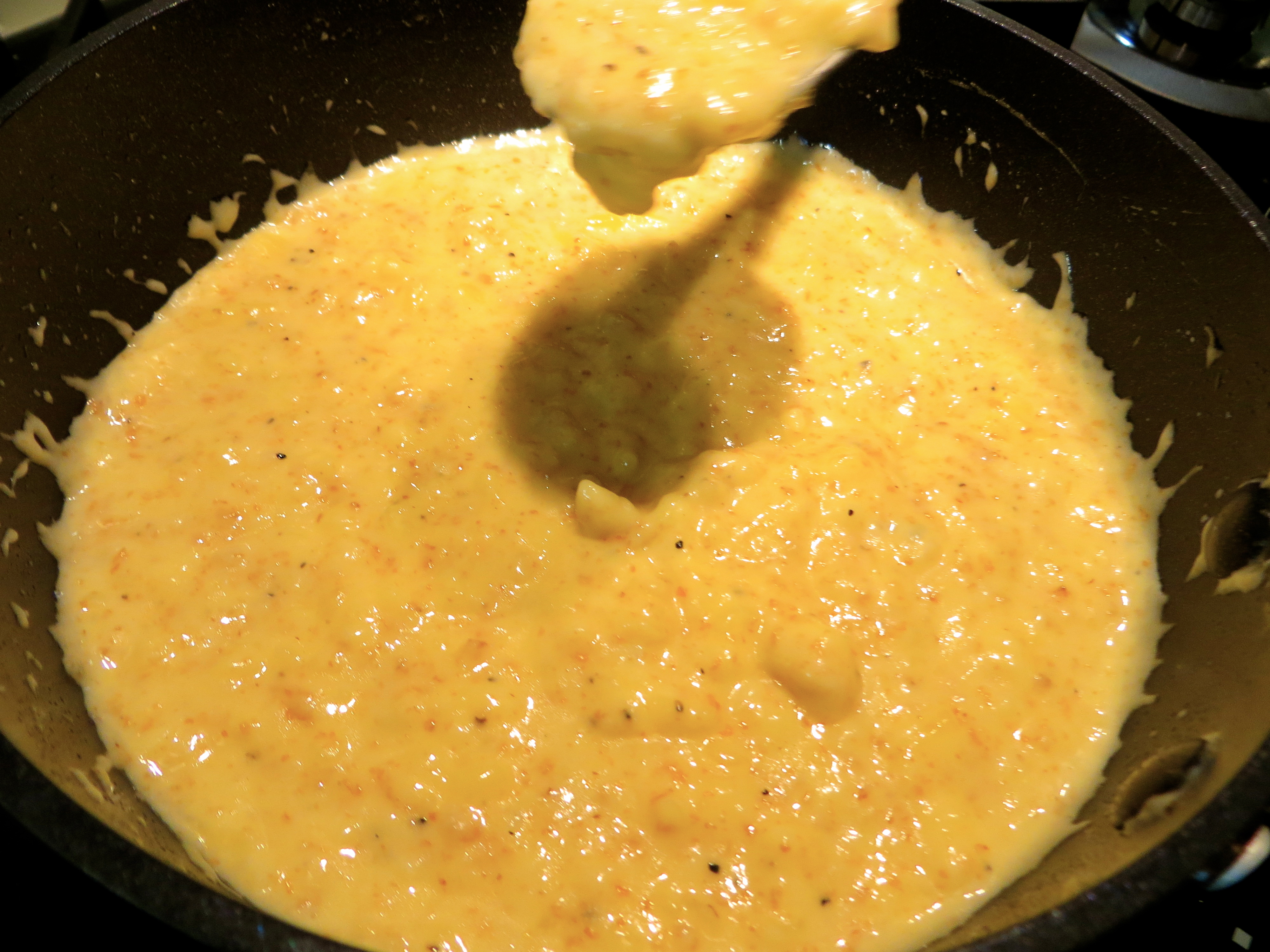And now add in the bag – yes the whole bag – of the medium grated cheese. Remember to keep the burner on low, and to keep stirring.